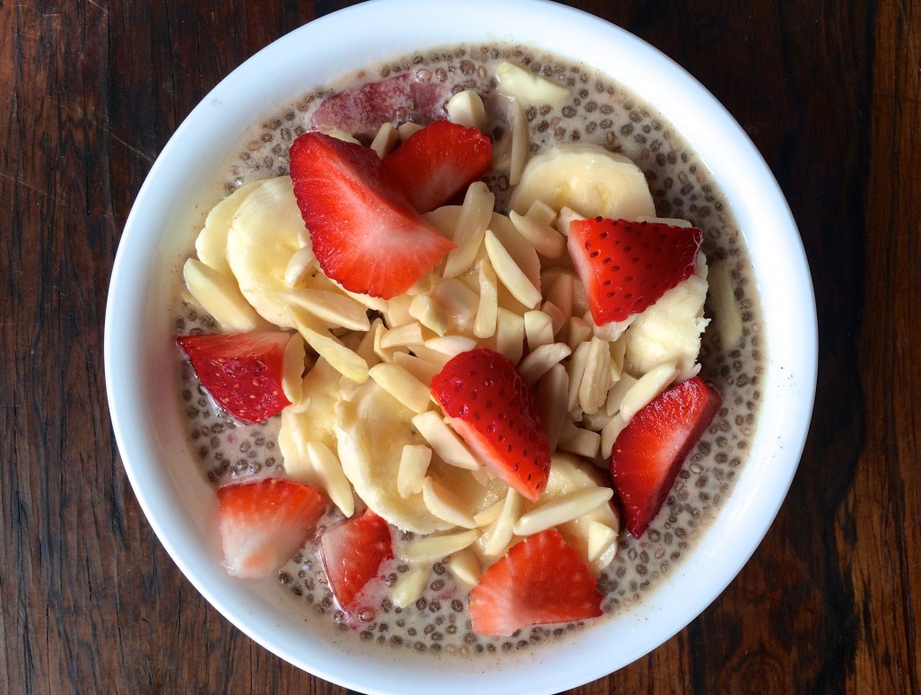 1. Combine all ingredients minus fresh fruit and crunchies in a tupperware or jar. Pick a storage size that allows some room for expansion, as the chia seeds will grow as they absorb the liquid.