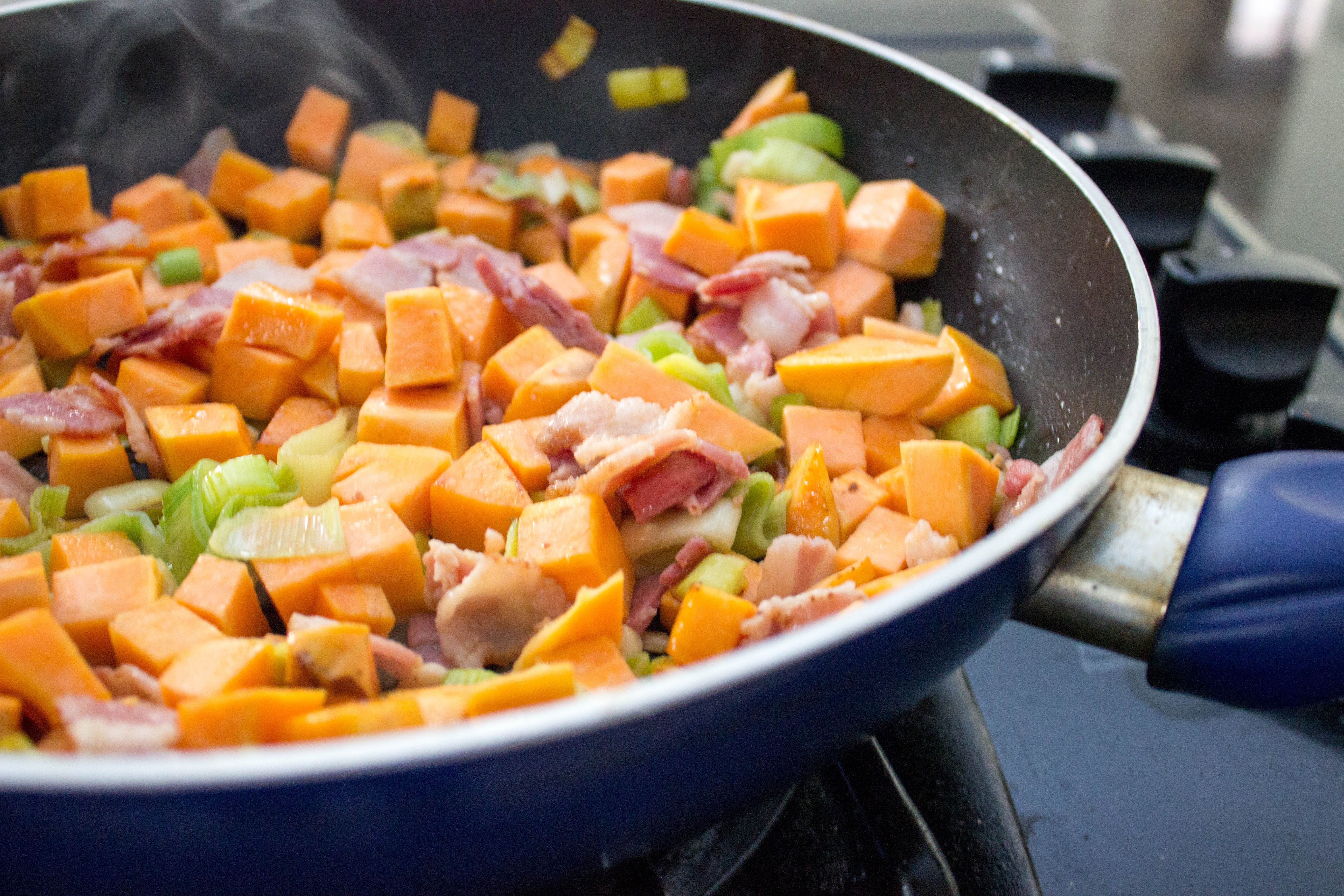 7. Once all white wine has been cooked off, test to see if sweet potatoes are done. If you can stab them easily with a fork, you’re good to go.