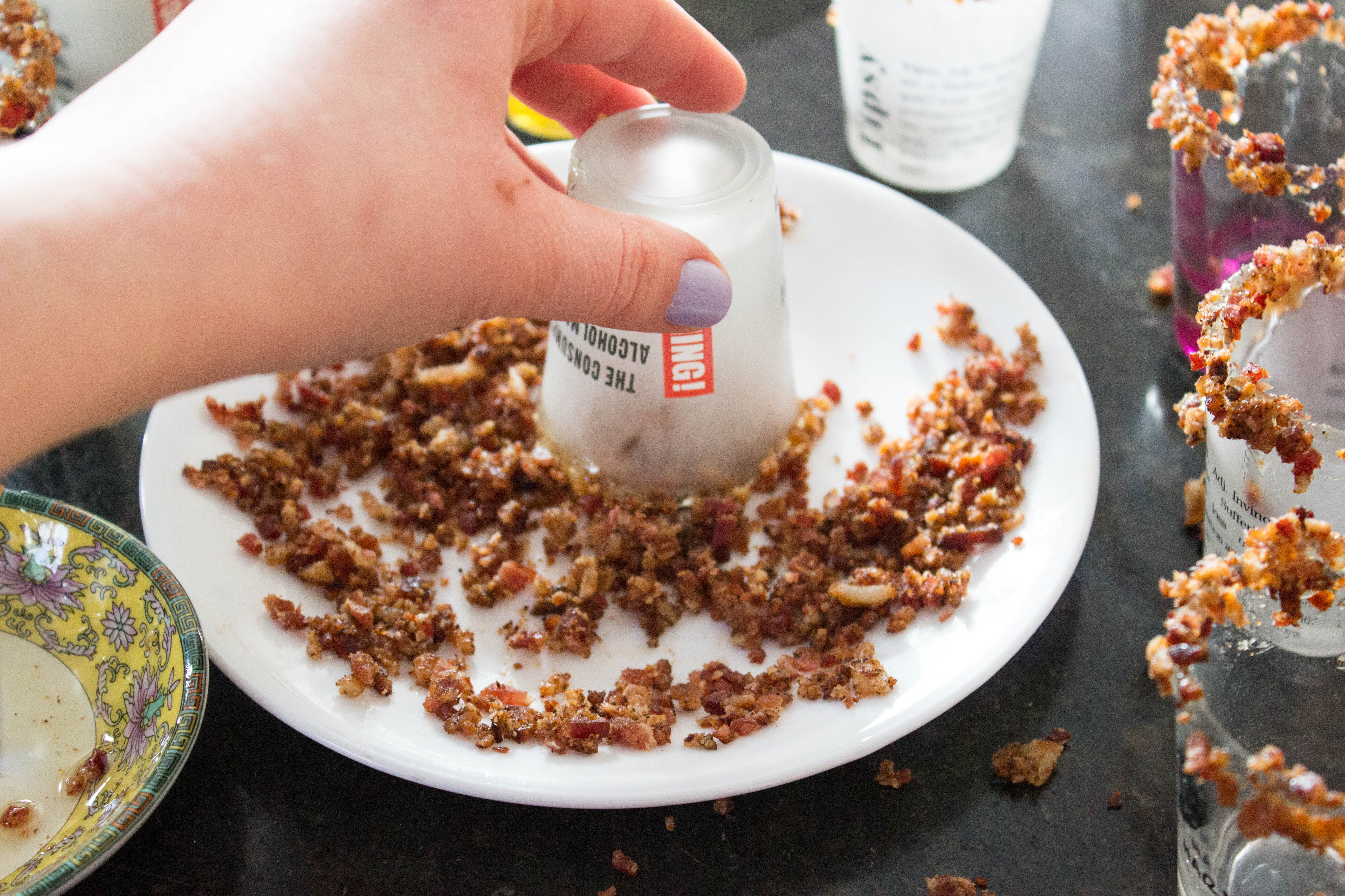 - Dip the shot glass into the plate of mega-chopped bacon and twirl so entire rim is covered.