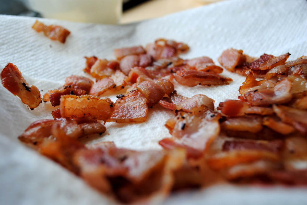 - Transfer your patted down bacon to a cutting board and just go to town chopping it. Even smaller than bacon bites. I’ve tried to do this in my food processor before but the bacon is typically too meaty or greasy that it never works. Do it the old fashioned way. Chop the daylights out of it with the sharpest knife you own. Get out any aggression you have while you’re at it.