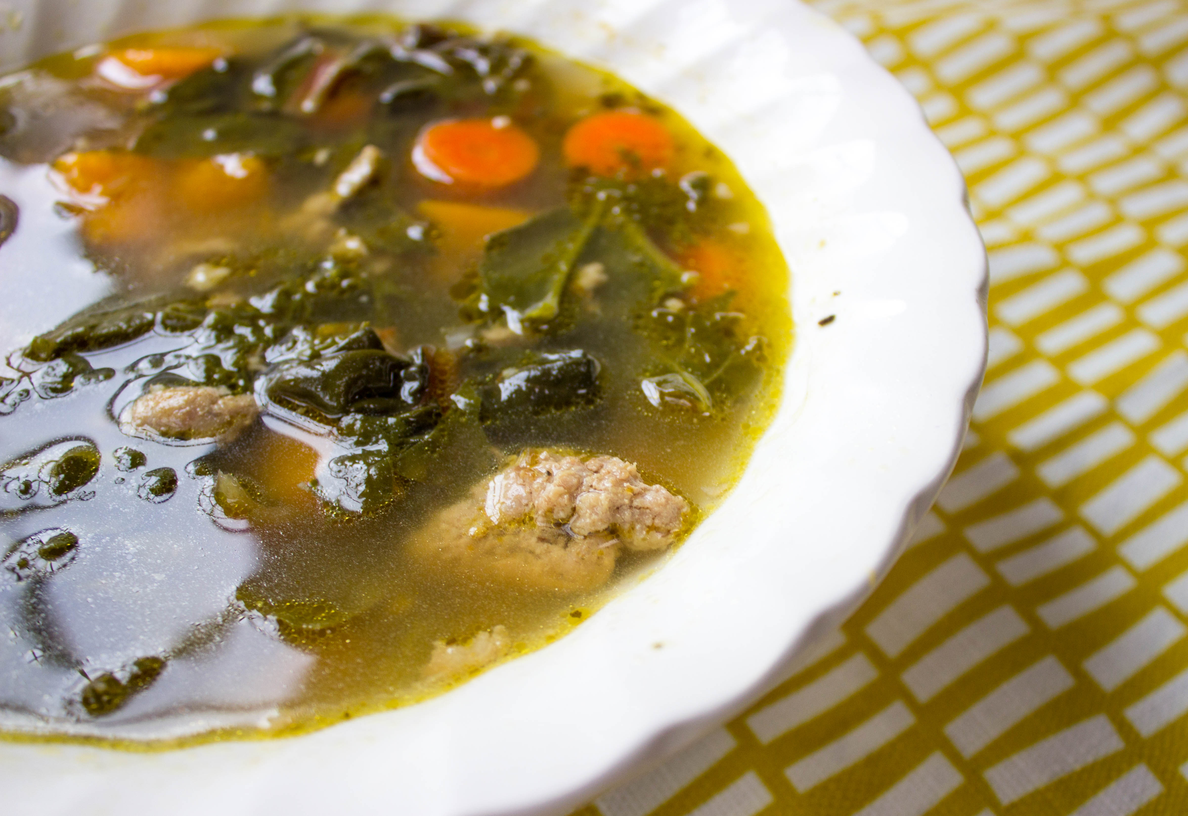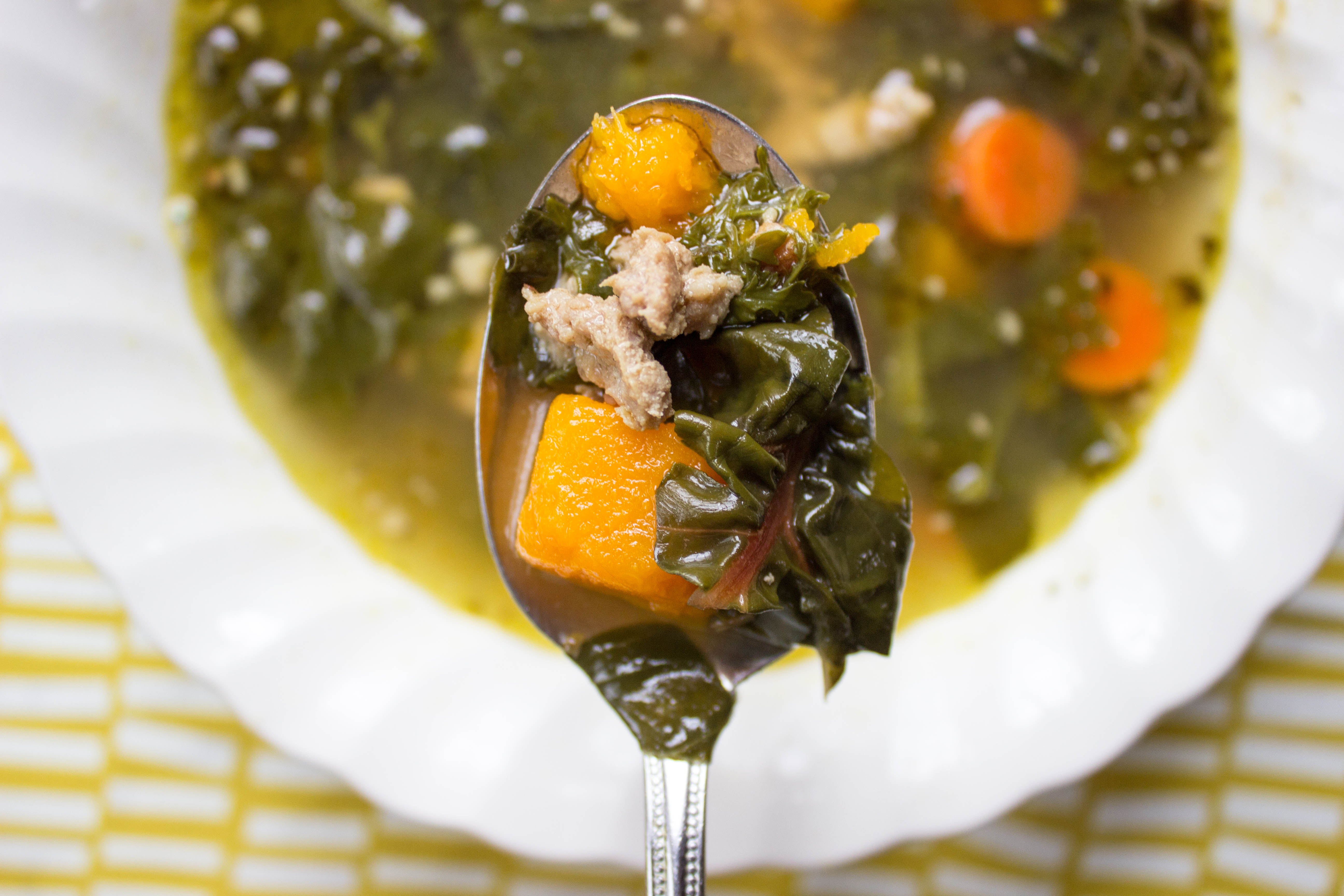 This soup came as an accident. I got my weekly farm share basket and opened it to find ground pork, butternut squash, and kale. Sometimes whenever I open my basket I like to pretend I’m on the TV show Chopped and have to cook for Alex Guarneschelli. She is a real hardass, so this thought alone always pushes me to make something good.