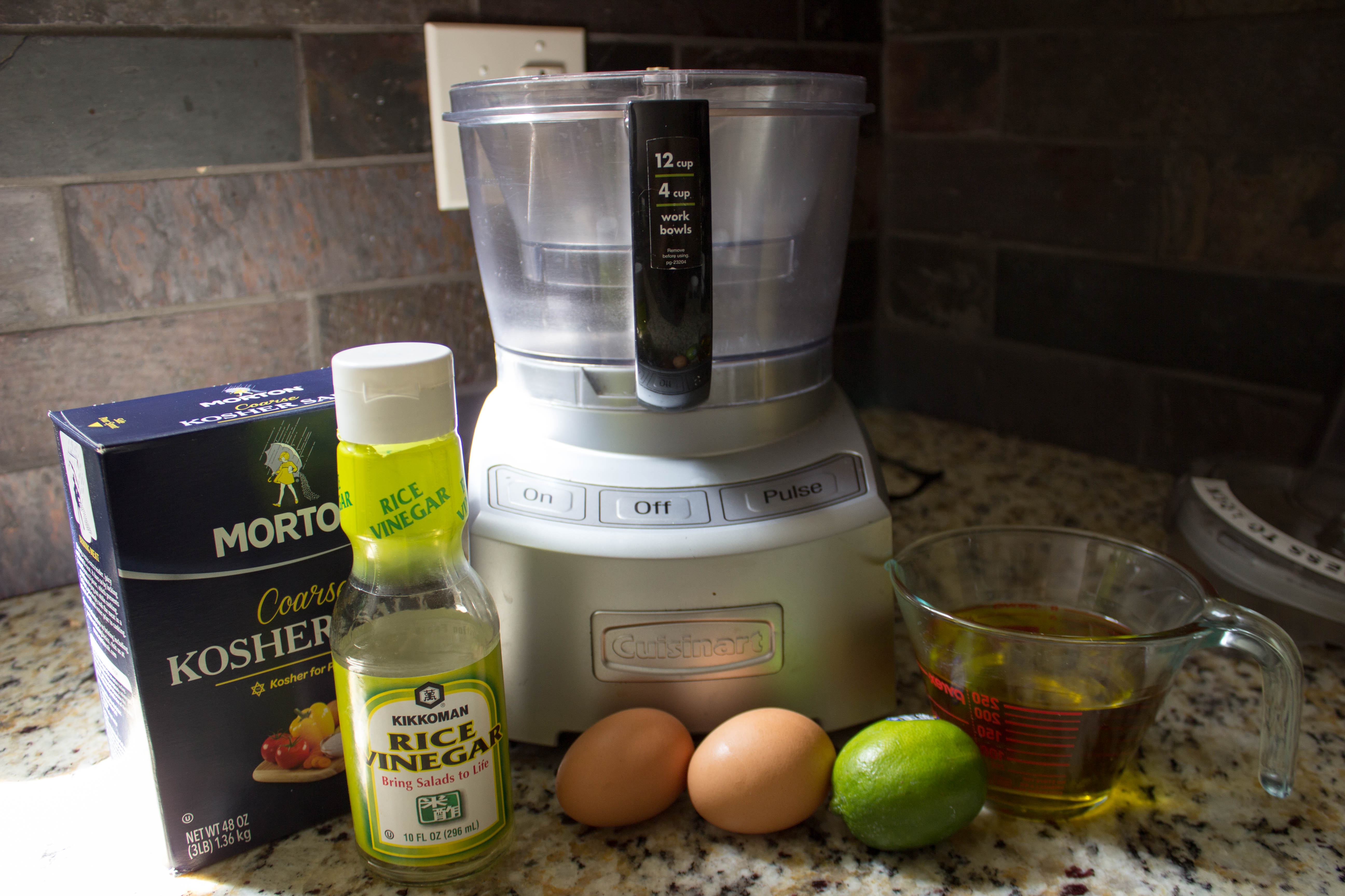 - Add all aioli ingredients except olive oil to your food processor.