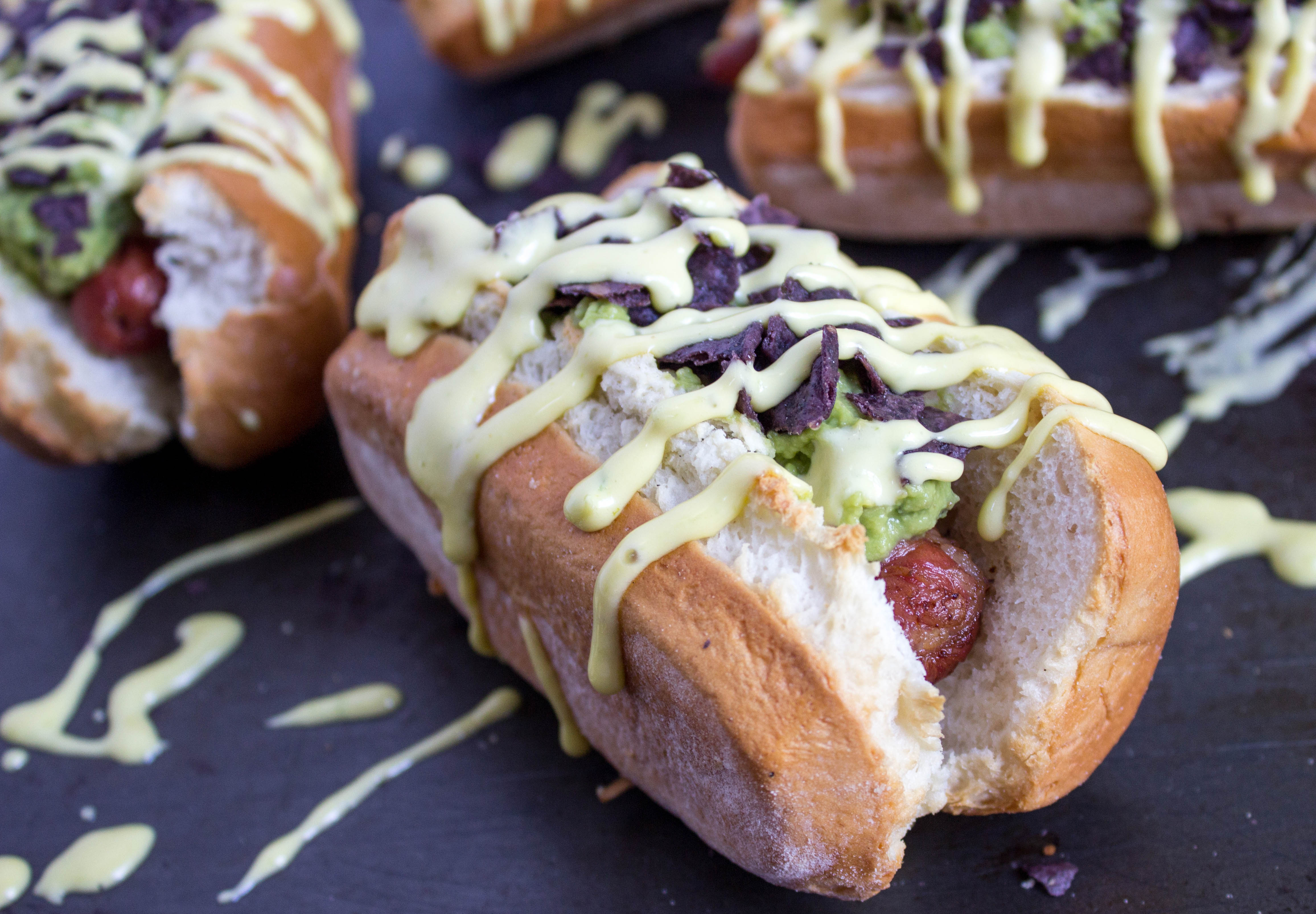 - Place bacon-wrapped hot dog in bun, top with guacamole, crushed Garden of Eatin’ blue corn chips, and drizzle with jalapeño lime aioli.