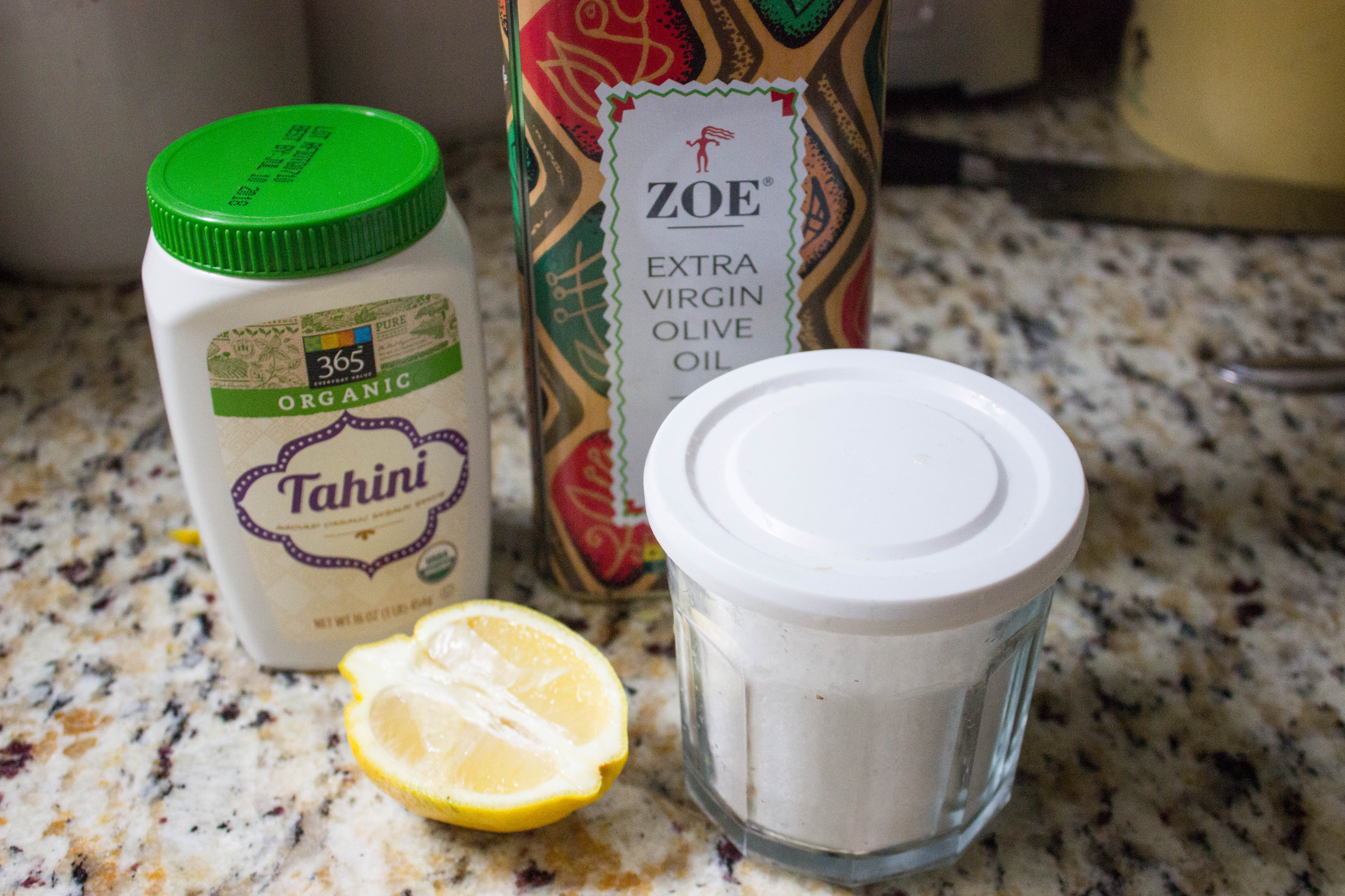 - Add the tahini, lemon juice, olive oil, water, and salt for the tahini sauce to a blender or Magic Bullet.