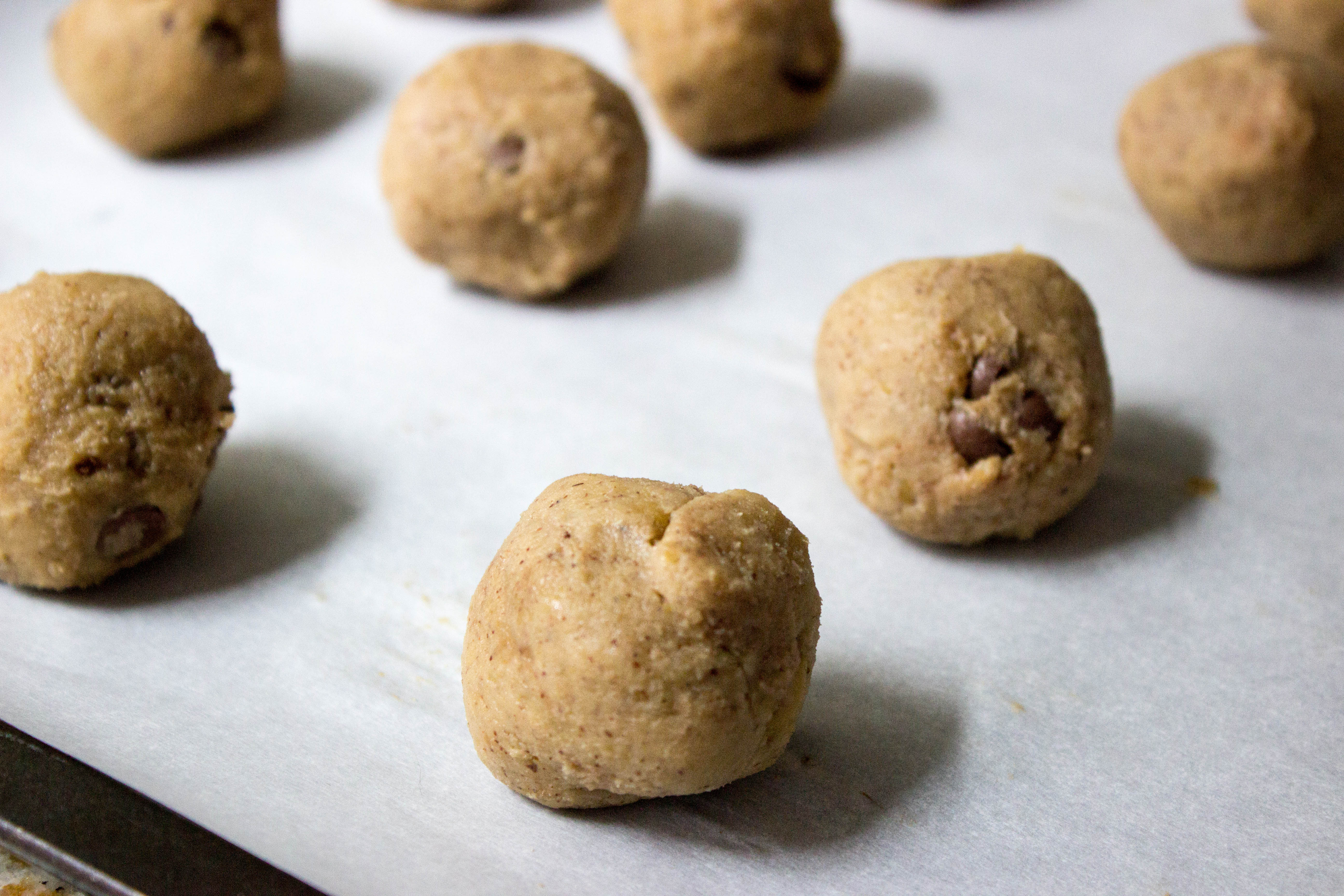 - Take about 1 tablespoon of cookie dough and roll into a ball. Place on baking sheet.