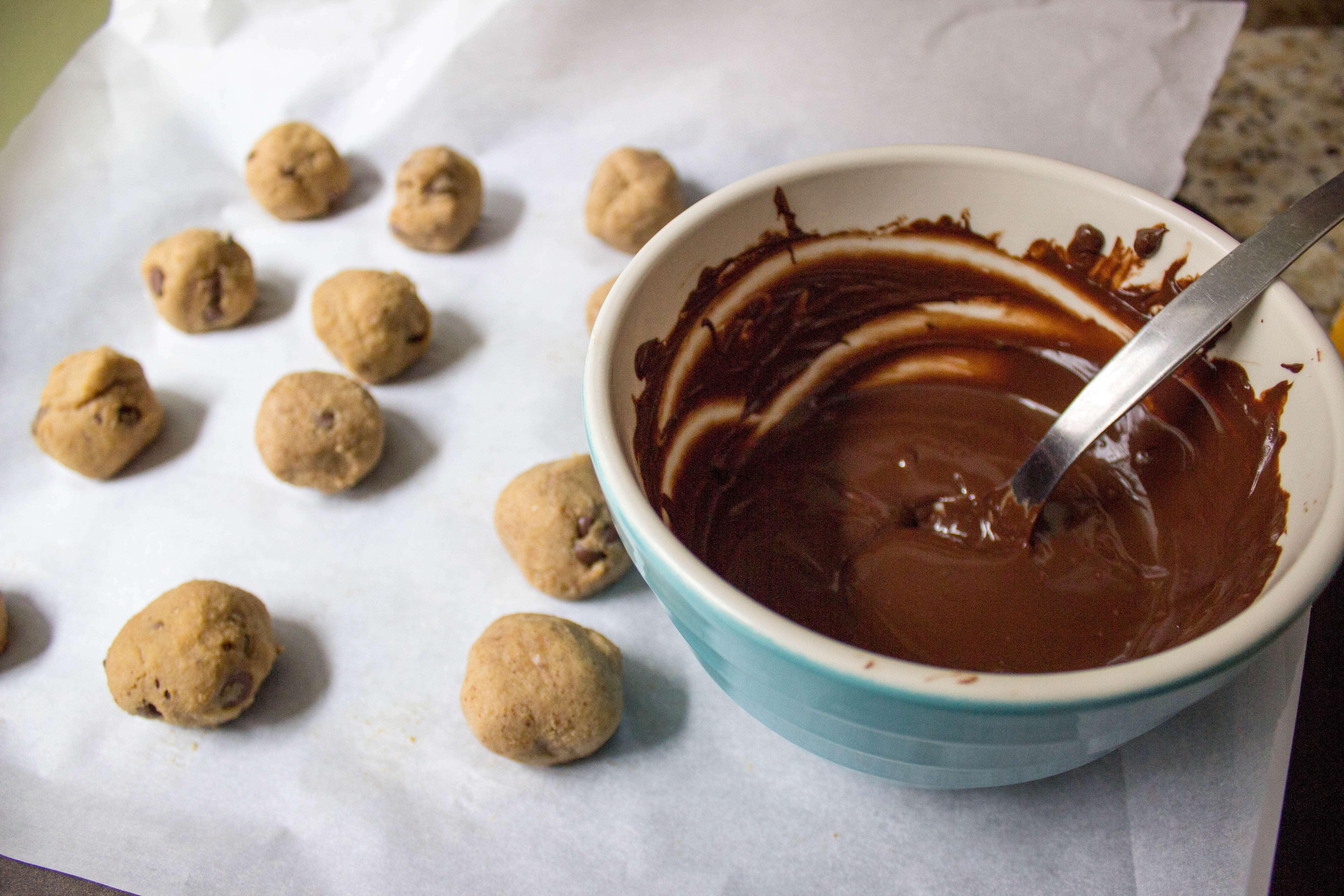 - After your cookie dough balls have chilled, roll them in the melted chocolate and place back on baking sheet.