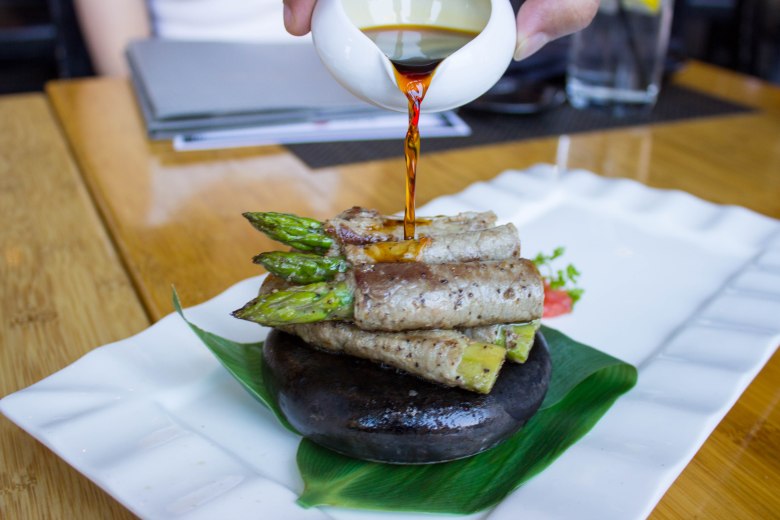 Oh baby, where do I begin. This dish starts with a beautiful ribeye that is then wrapped around beefy asparagus and served on a hot stone. The soy mirin sauce is then poured onto the dish tableside, and you get to hear the whole thing sizzle. Once you take a bite, your eyes will roll back in your head and you will probably find God.