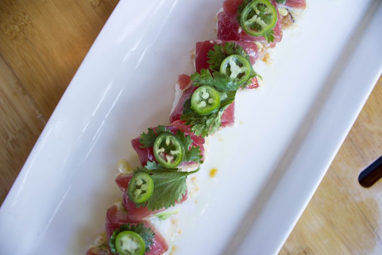 The roll is basically all of my dreams come true. Spicy, fatty tuna combined with melt-in-your-mouth avocado, a kick from thinly sliced jalapeños, cilantro, and a bright and citrusy yuzu olive oil.