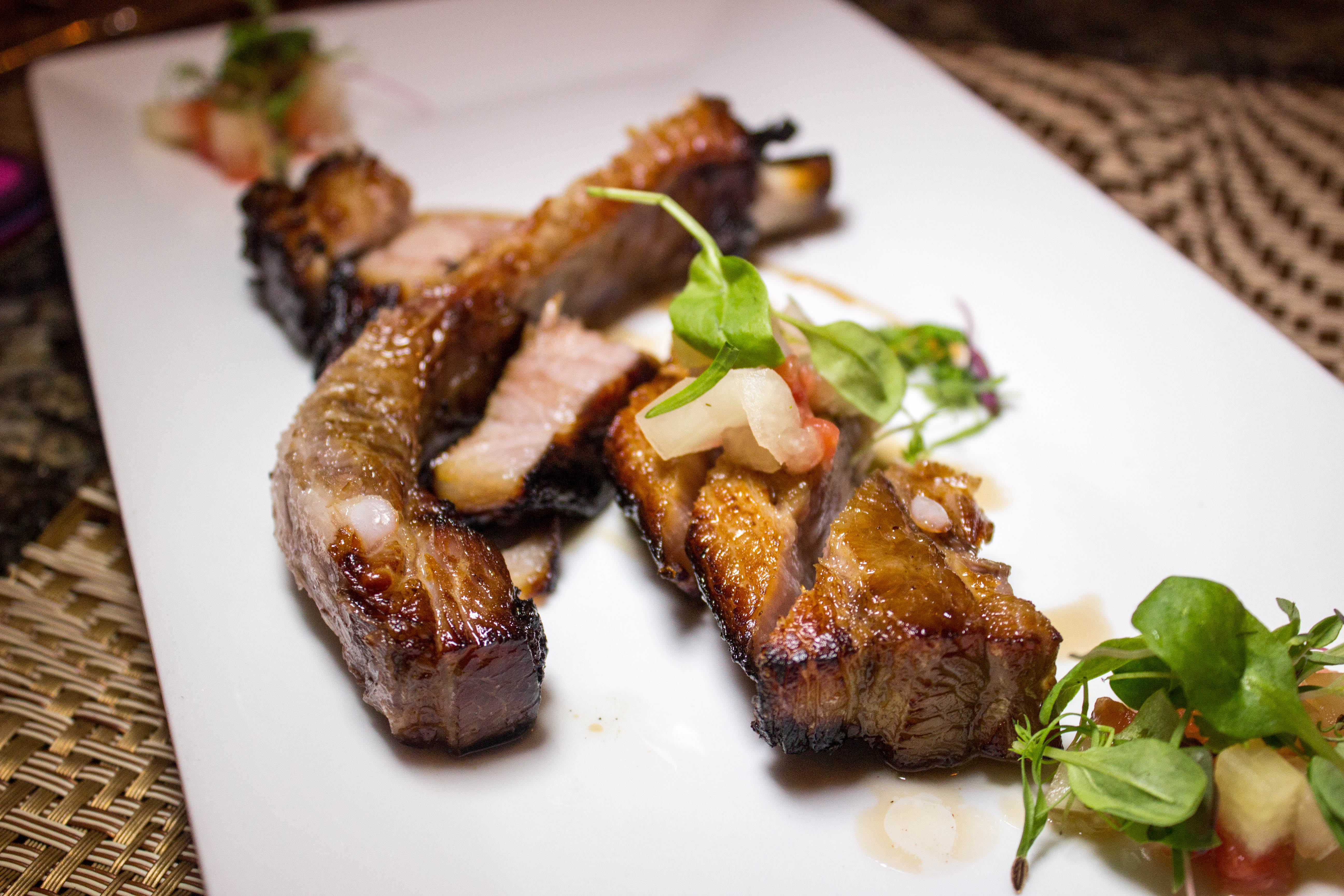 Apple Cured Kurobata Bone-In Bacon: pickled watermelon rind and Abita root beer glaze