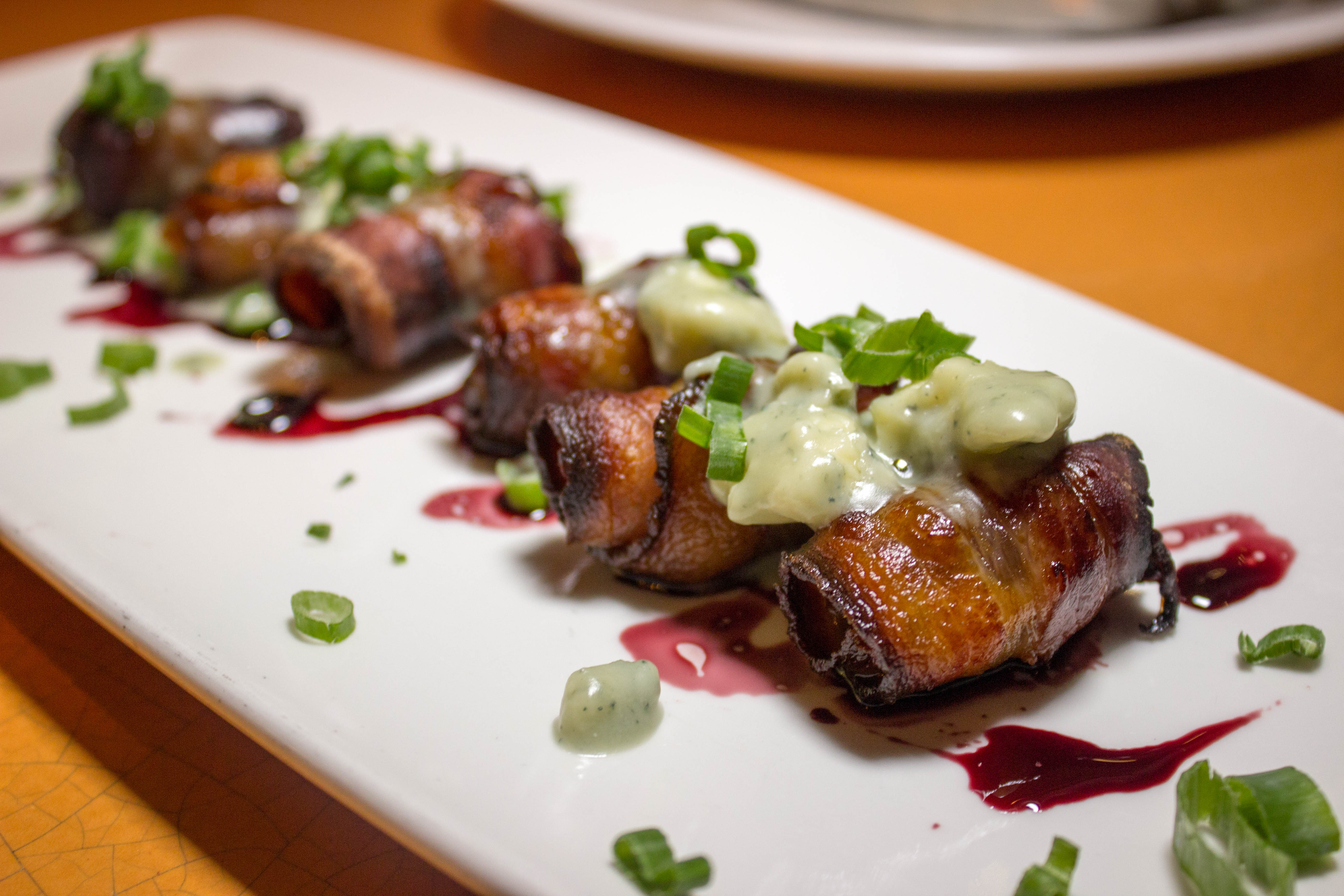 Bacon Wrapped China Ranch Dates: Marcona almond-port wine sauce, Point Reyes blue cheese