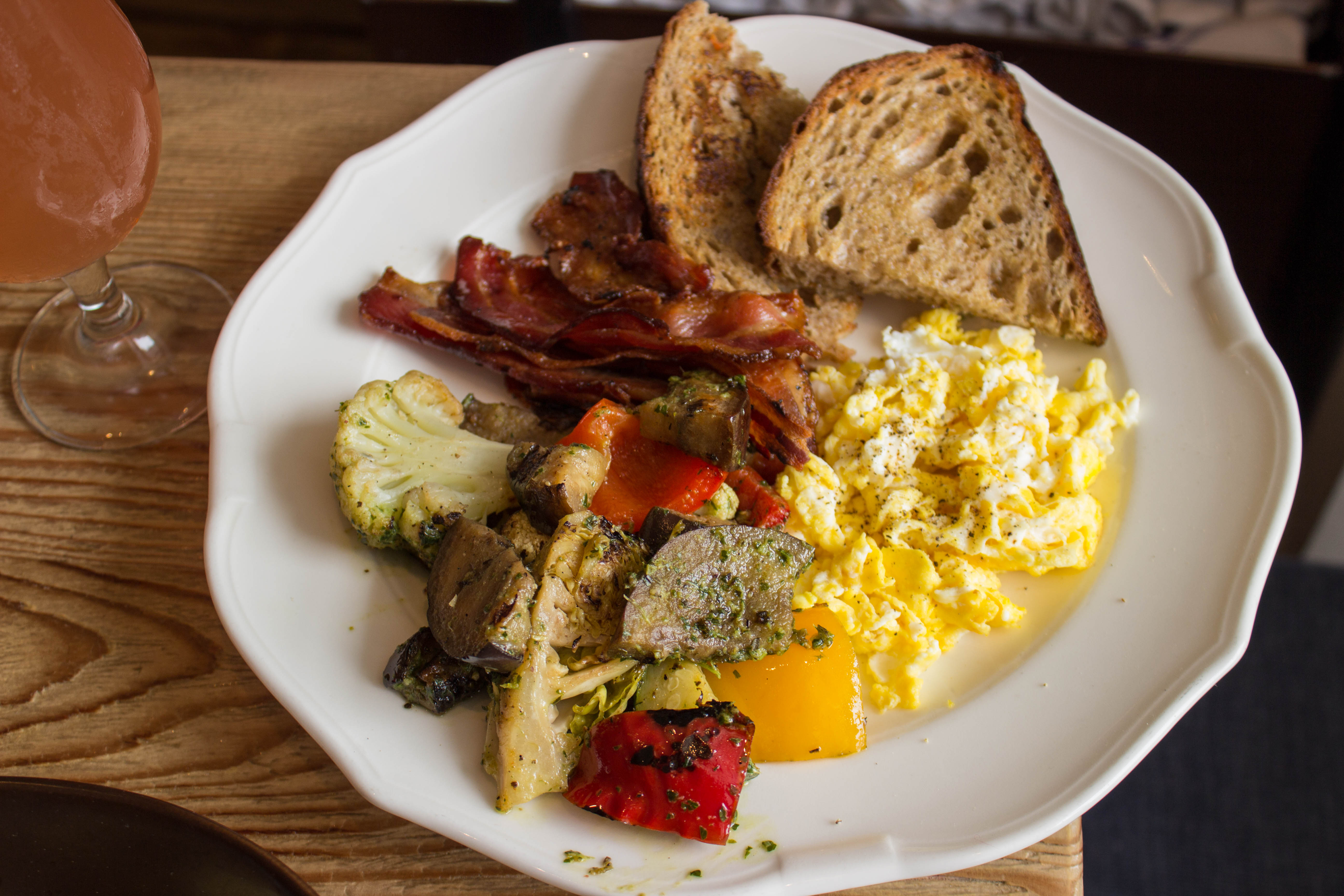 The Farmer’s Breakfast Plate is really where Farmhouse shines. Fresh eggs, deep flavors in roasted veggies plus meaty bacon and grilled sourdough come come together for a plate of real, nourishing food.
