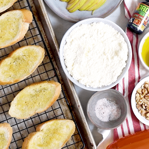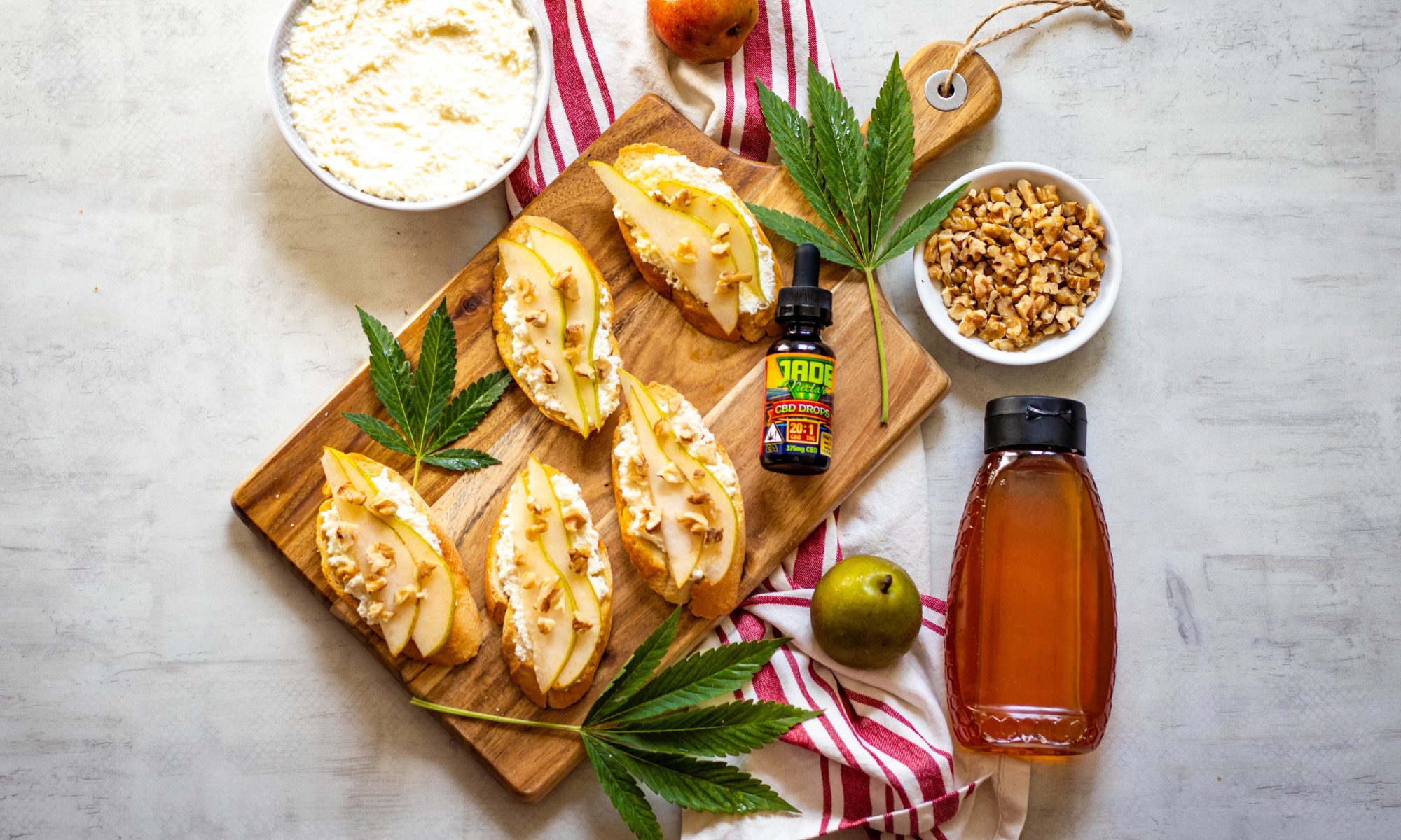 Time to assemble! Spread ricotta on crostini, then add pear slices, chopped walnuts, a drizzle of honey, a pinch of salt, and a drizzle of the CBD olive oil mixture. Serve!