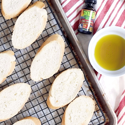 Preheat oven to 350 degrees Fahrenheit. In a small bowl, combine olive oil, salt, and Jade Nectar CBD drops and whisk together. For each teaspoon of olive oil, add 1 full dropper of Jade Nectar CBD drops.