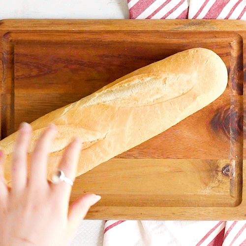 Using a bread knife, slice baguette into ¼ inch thick slices.