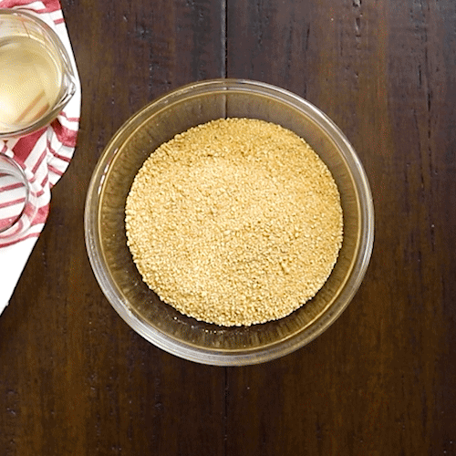 In a large bowl, combine crumbs, coconut oil or butter, and water with a fork. Add the liquid gradually and stir in between. You will know you have the right consistency when you take a pinch in your hands and the crumbs stick together.