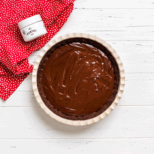 I’m all for an infused addition to the holiday dinner or dessert table, and this chocolate ganache pie is a classy way to go about it. This dessert is made with Pantry Keto Chocolate Bites, which is now one of my favorite chocolate edibles! This product comes in a jar with 20 servings, and each bite is the perfect amount of chocolatey goodness lightly sweetened with coconut sugar. Because many of you out there might be trying the keto diet, I decided to make an entire dessert out of this product I know you’re going to love!
