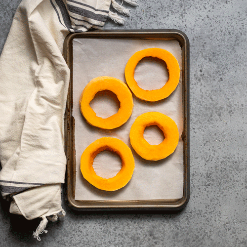 Prep butternut squash by cutting in half and removing the peel. Remove seeds from the base of squash and then cut into rings.