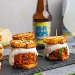 Assemble your sliders by spooning some sauce onto your crostini. Then add meatball, mozzarella cheese, and another garlic bread crostini. We used a homemade vegan mozzarella, which was already a melted consistency. To make these with store bought mozzarella, place your crostinis back into the broiler for another minute or so before putting the top crostini on your slider. Enjoy!