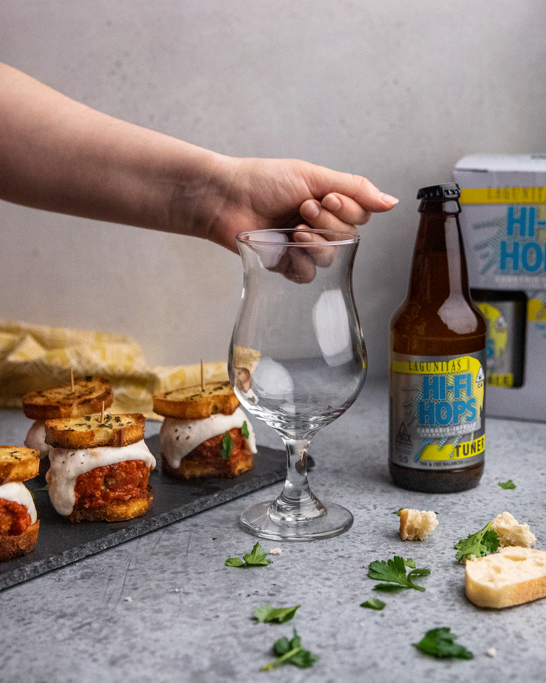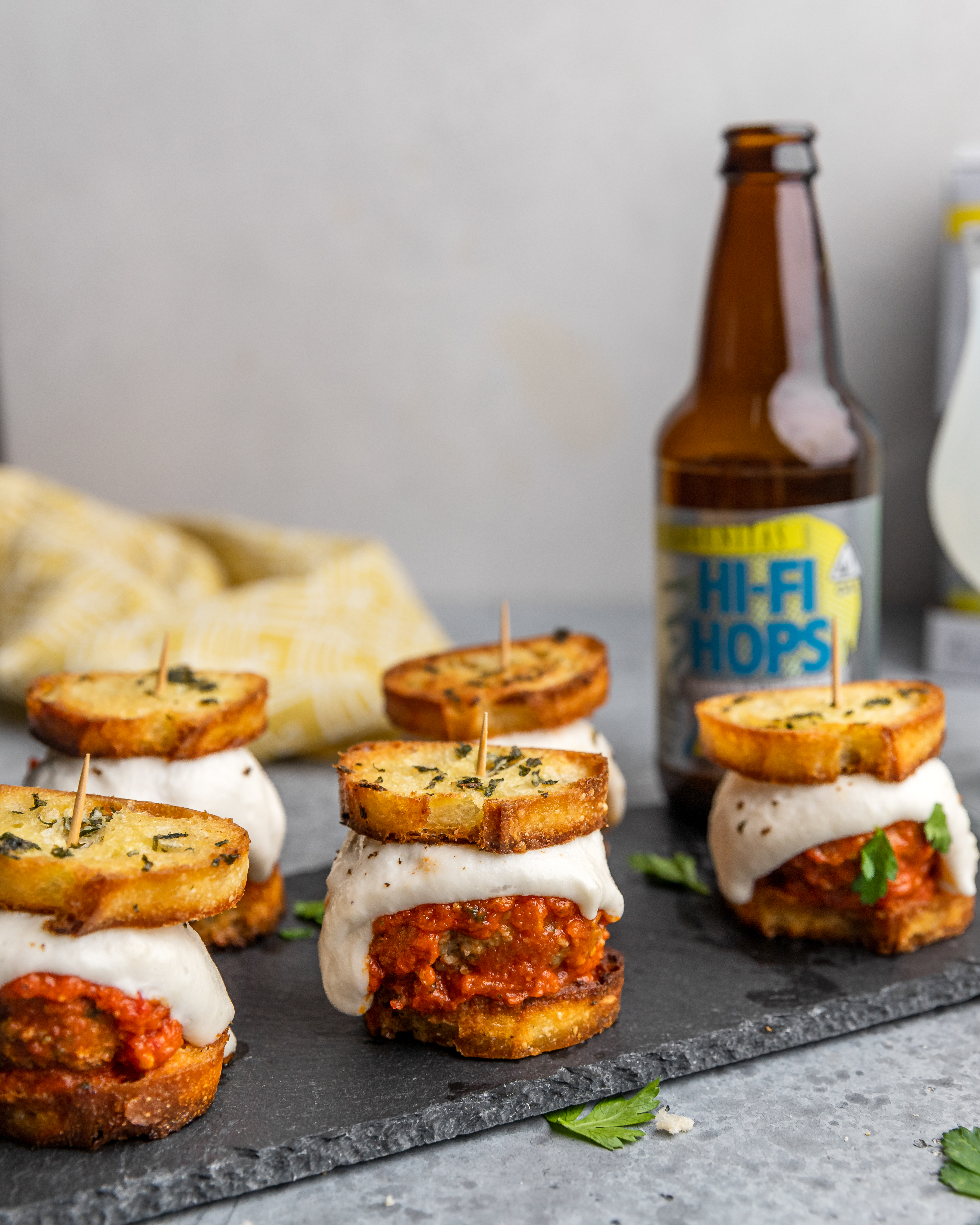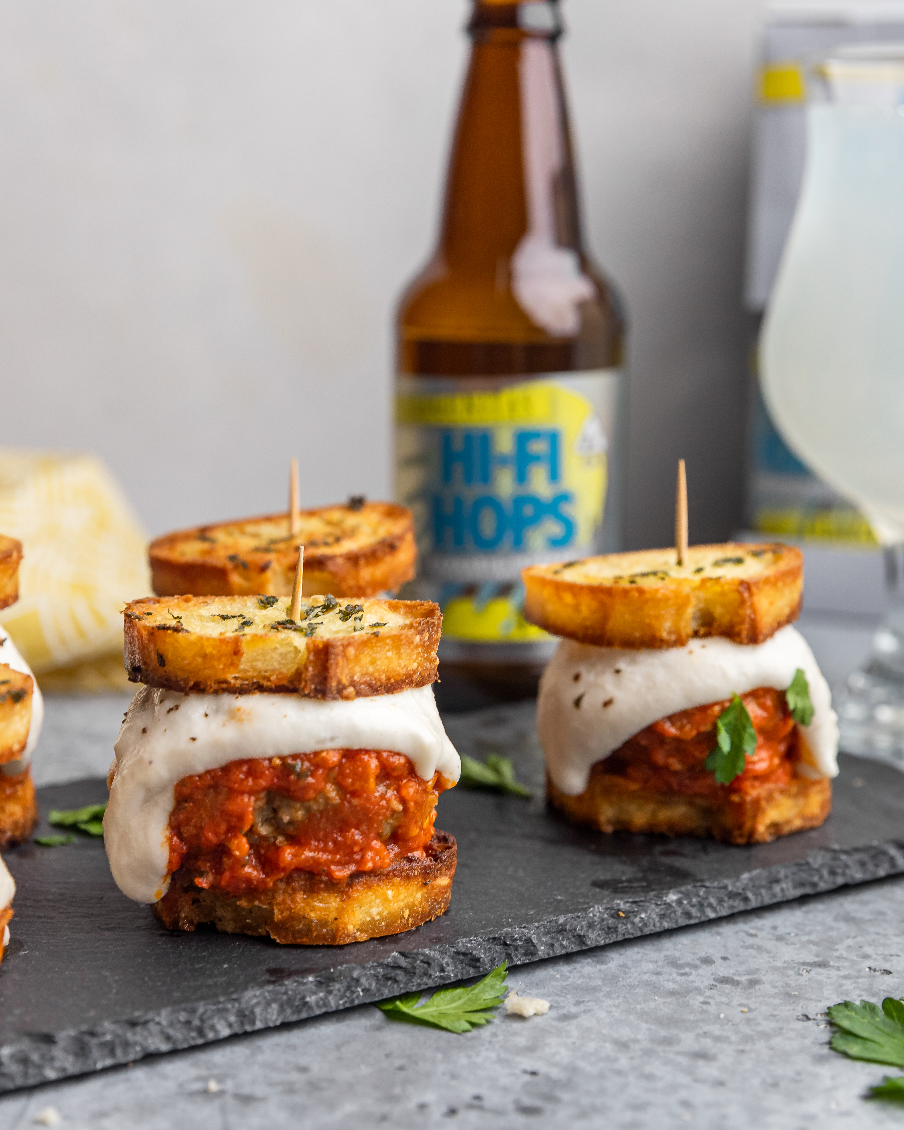 I love the comforting and classic feeling of eating spaghetti and meatballs with garlic bread, but it’s not the most portable of foods. Because I think the essence of this Italian classic should be enjoyed even if you don’t have a fork and knife, I created these Italian meatball & garlic bread sliders! Why not up the comfort level even further by pairing these delicious sliders with an ice cold Hi-Fi Hops Tuner from Lagunitas and ABX?