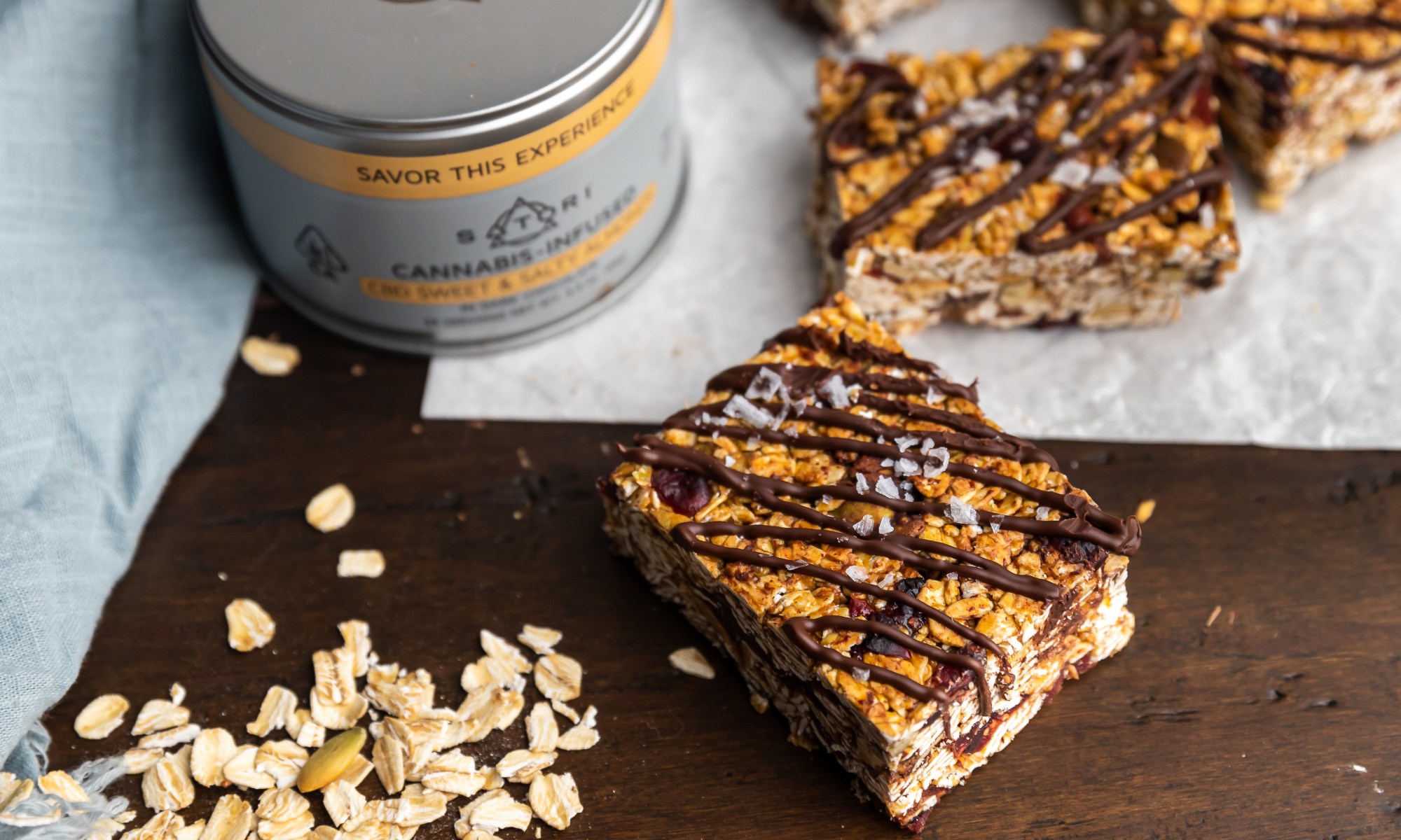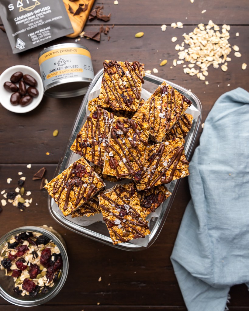 Few things are more enjoyable than nourishing your body and getting a little elevated before heading out on an adventure. To get you in the perfect state of mind for whatever journey is ahead of you, we created these delicious and portable Chocolate Cranberry Almond Granola Bars! Loaded with tasty morsels like pumpkin seeds, dried cranberries, and Satori CBD Sweet & Salty Almonds in Dark Chocolate, we amp up the delicious value even further by adding a final drizzle of Satori Singles Dark Chocolate!