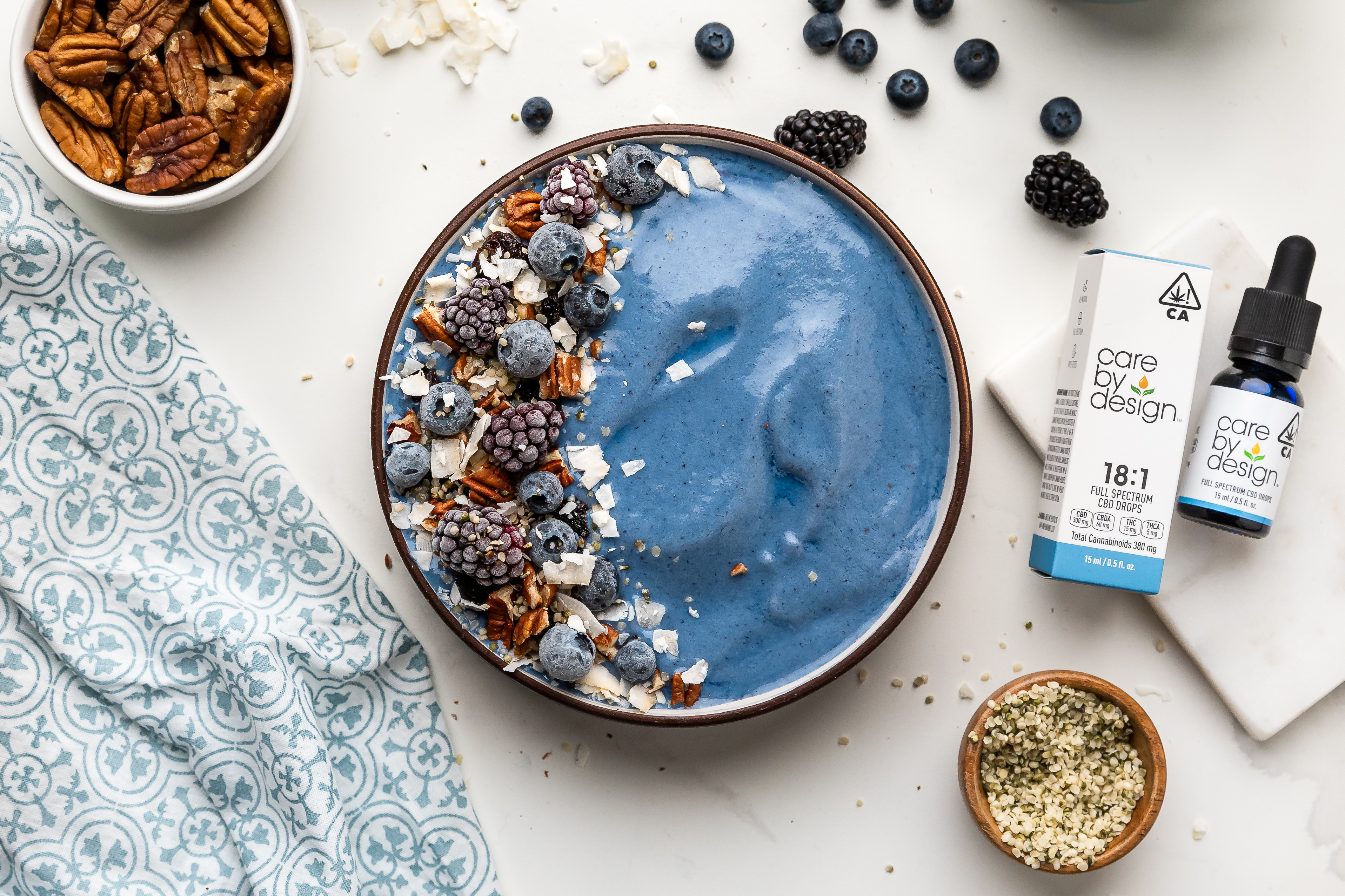 Smoothies are a fun thing to make because they’re essentially a blank canvas! Fruits, veggies, and your milk of choice can come together in seemingly infinite flavor and color combinations. We might be biased, but we think we’ve found the best and most vibrant flavor combination: the Dreamy Blue Smoothie bowl! This colorful masterpiece is made with yummy banana, riced cauliflower, blueberries, and hemp seeds, our favorite Care by Design 18:1 CBD drops, and made a dreamy blue color by using blue spirulina!