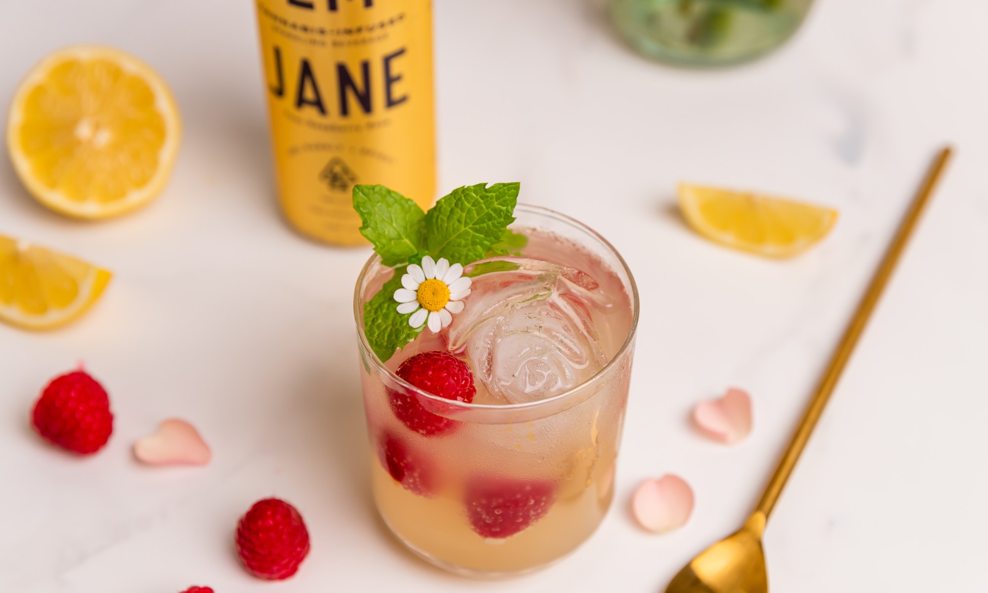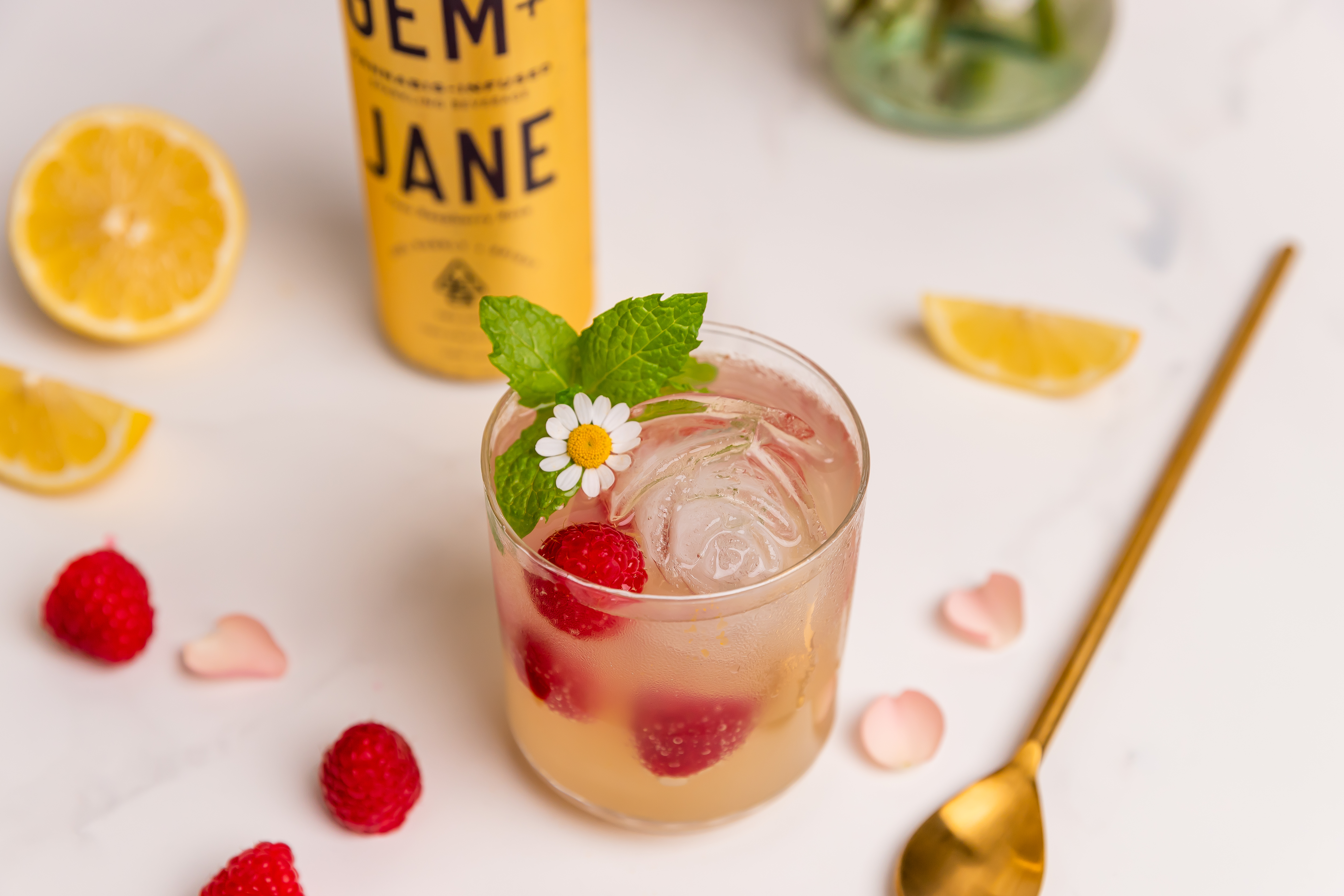 Place an ice cube in a clean glass. Add ¾ oz lemon simple syrup, a few raspberries, and top off with Gem + Jane Yuzu Raspberry Rose. Stir mixture using a barspoon. Optional: garnish with fresh mint