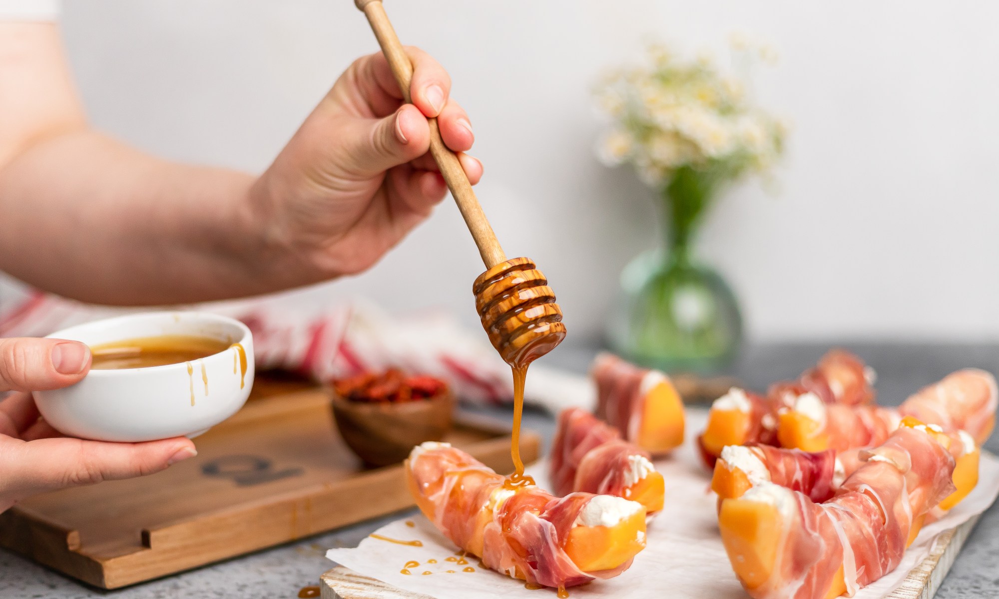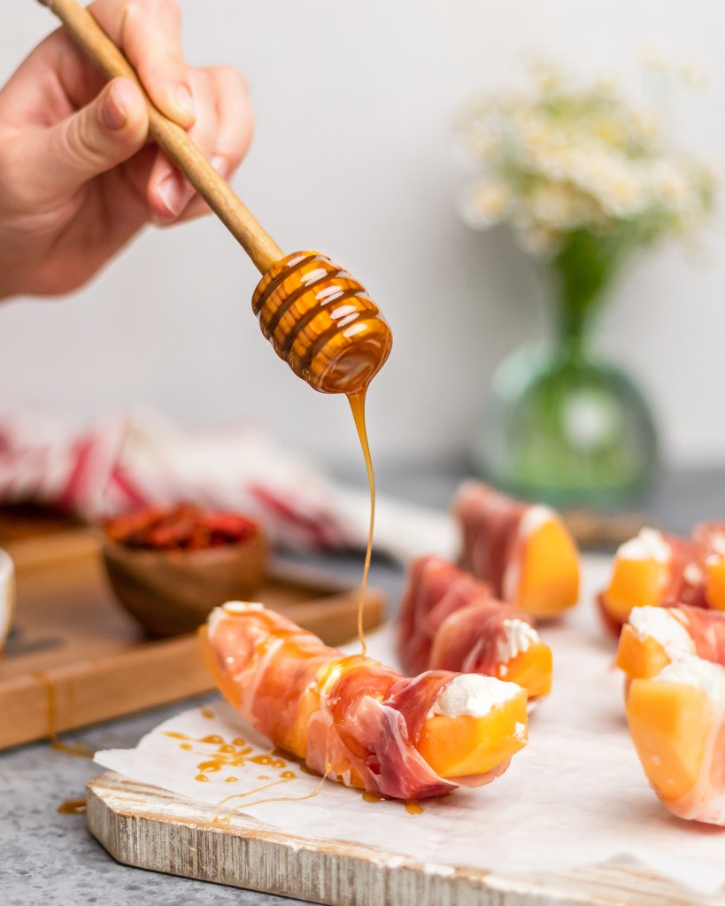Drizzle wrapped melon slices with your spicy infused honey!