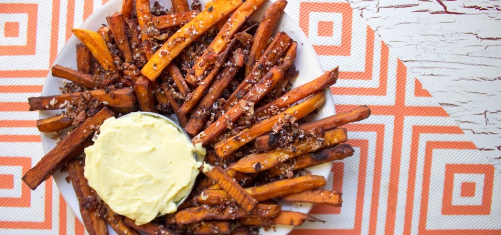 Bacon Seasoned Sweet Potato Fries with Lime Aioli